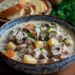 - Faire la liaison : Dans un bol, mélangez la crème fraîche avec la farine jusqu’à ce que le mélange soit lisse. Versez lentement une partie du bouillon chaud sur ce mélange tout en remuant constamment pour éviter les grumeaux. Reversez ce mélange dans la casserole avec le reste du bouillon.